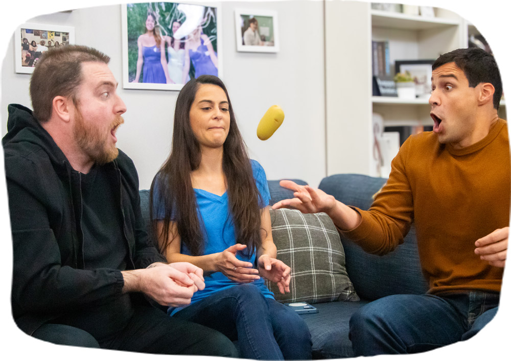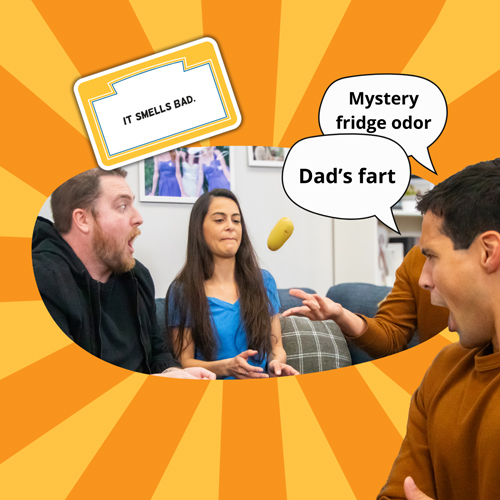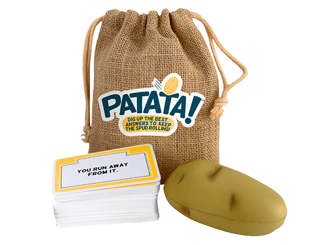 Grab the squishy potato and a Theme Card, read it aloud, say a fitting word or phrase, then toss it on.